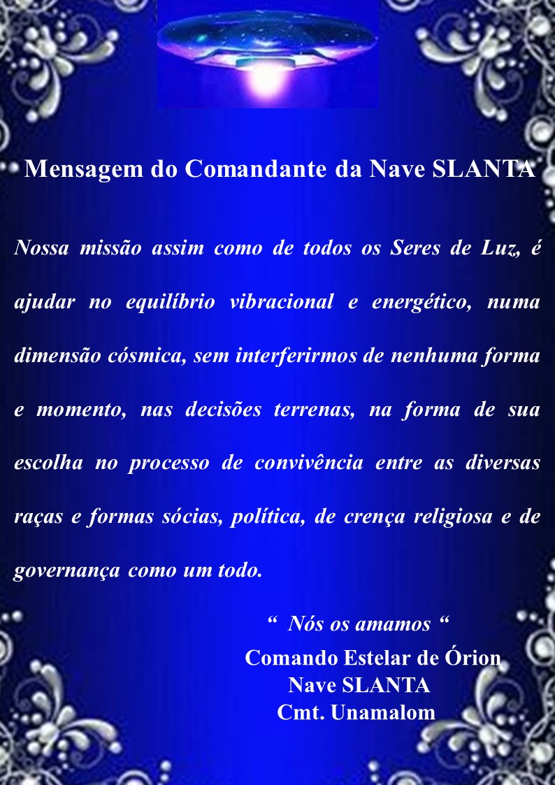 “Confraternizo-me com todos os Seres do    Planeta  terra. Saúdo-os por estarem abrindo as vossas percepções e de forma inteligente, olharem para a imensidão do espaço sideral e entenderem que nunca estiveram sós…
