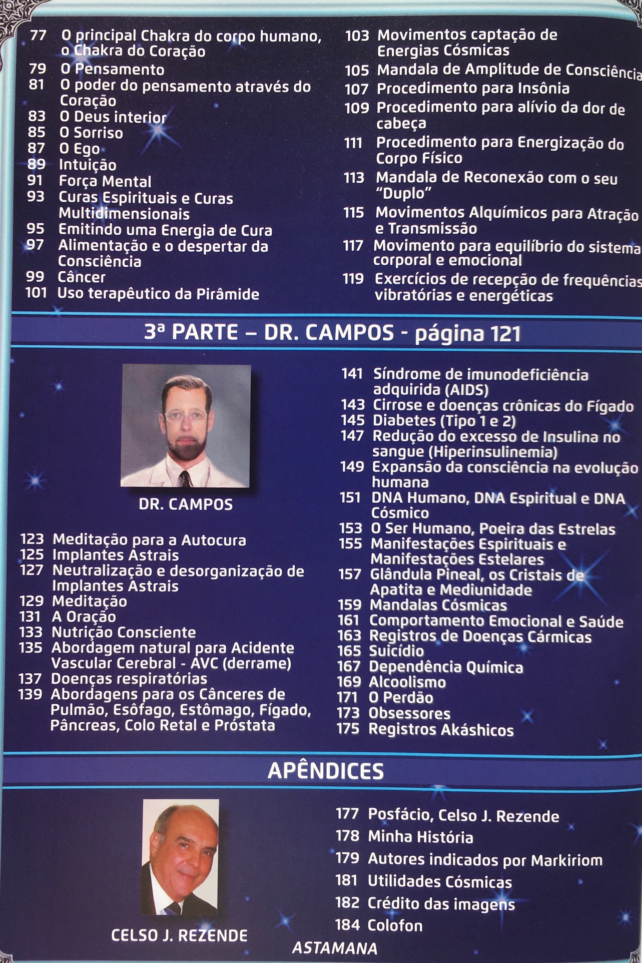 Meditação para a Autocura – Implantes Astrais – Neutralização e desorganização de Implantes Astrais-Meditação-A Oração-Nutrição Consciente-Abordagem natural para Acidente Vascular Cerebral-AVC (derrame)-Doenças respiratórias-Abordagens para os Cânceres de Pulmão, Esôfago, Estômago, Fígado, Pâncreas, Colo Retal e Próstata-Síndrome de Imunodeficiência Adquirida (AIDS)-Cirrose e doenças crônicas do fígado-Diabetes (Tipo 1 e 2)-Redução do excesso de Insulina no sangue (Hiperinsulinemia)-Expansão da Consciência na evolução humana-DNA humano, DNA Espiritual e DNA Cósmico- Ser humano, Poeira das Estrelas-Manifestações Espirituais e Manifestações Estelares-Glândula Pineal, os cristais de Apatita e Mediunidade-Mandalas Cósmicas-Comportamento Emocional e Saúde-Registros de doenças cármicas-Suicídio-Dependência química-Alcoolismo-O Perdão-Obsessores-Registros Akáshicos.